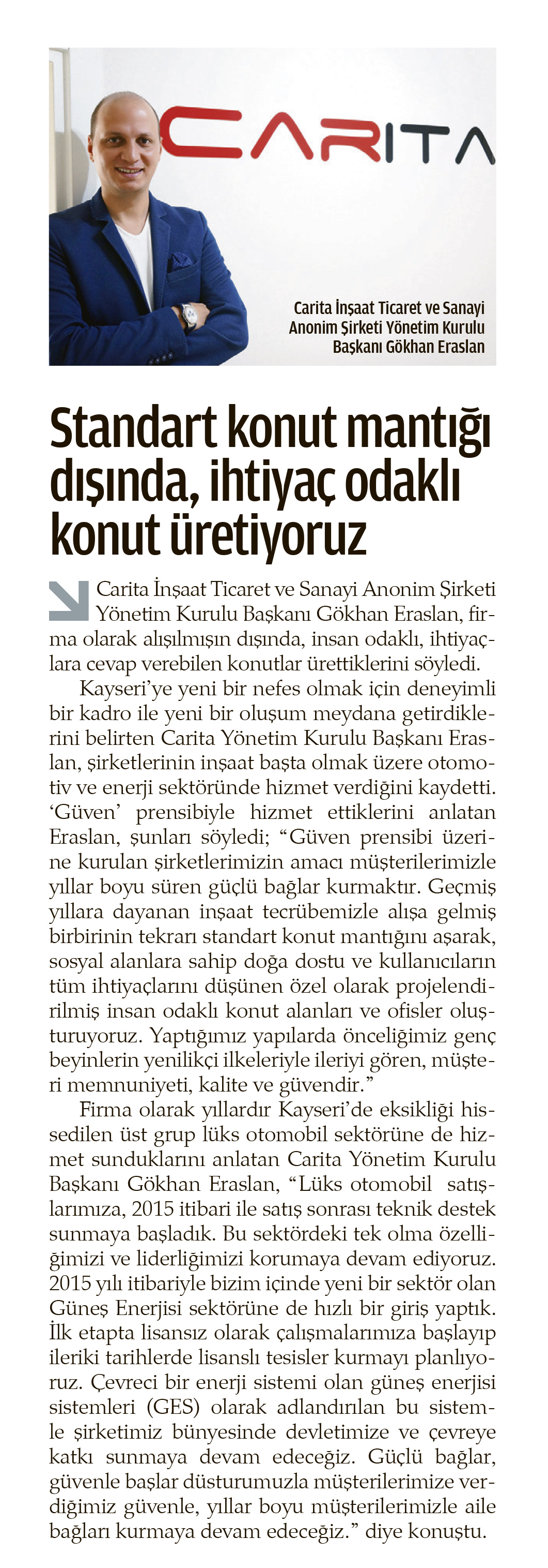 Carita İnşaat Ticaret ve Sanayi Anonim Şirketi Yönetim Kurulu Bașkanı Gökhan Eraslan, firma olarak alışılmışın dışında, insan odaklı, ihtiyaçlara cevap verebilen konutlar ürettiklerini söyledi. Kayseri'ye yeni bir nefes olmak için deneyimli bir kadro ile yeni bir oluşum meydana getirdiklerini belirten Carita Yönetim Kurulu Başkanı Eraslan, șirketlerinin inşaat bașta olmak üzere otomotiv ve enerji sektöründe hizmet verdiğini kaydetti. 'Güven' prensibiyle hizmet ettiklerini anlatan Eraslan, șunları söyledi; "Güven prensibi üzerine kurulan şirketlerimizin amacı müşterilerimizle yıllar boyu süren güçlü bağlar kurmaktır. Geçmiş yıllara dayanan inşaat tecrübemizle alışa gelmiş birbirinin tekrarı standart konut mantığını aşarak, sosyal alanlara sahip doğa dostu ve kullanıcıların tüm ihtiyaçlarını düşünen özel olarak projelendirilmiş insan odaklı konut alanları ve ofisler oluşturuyoruz. Yaptığımız yapılarda önceliğimiz genç beyinlerin yenilikçi ilkeleriyle ileriyi gören, müşteri memnuniyeti, kalite ve güvendir.' Firma olarak yıllardır Kayseri'de eksikliği hissedilen üst grup lüks otomobil sektörüne de hizmet sunduklarını anlatan Carita Yönetim Kurulu Başkanı Gökhan Eraslan, "Lüks otomobil satışlarımıza, 2015 itibari ile satış sonrası teknik destek sunmaya başladık. Bu sektördeki tek olma özelliğimizi ve liderliğimizi korumaya devam ediyoruz. 2015 yılı itibariyle bizim içinde yeni bir sektör olan Güneş Enerjisi sektörüne de hızlı bir giriş yaptık. Ilk etapta lisansız olarak çalışmalarımıza başlayıp ileriki tarihlerde lisanslı tesisler kumayı planlıyoruz. Çevreci bir enerji sistemi olan güneş enerjisi sistemleri (GES) olarak adlandırılan bu sistemle șirketimiz bünyesinde devletimize ve çevreye katkı sunmaya devam edeceğiz. Güçlü bağlar, güvenle başlar düsturumuzla müşterilerimize verdiğimiz güvenle, yıllar boyu müşterilerimizle aile bağları kurmaya devam edeceğiz." diye konuștu.