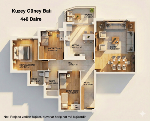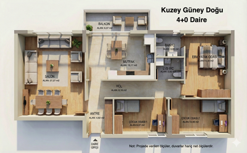 Fonksiyonel plan şeması, geniş yaşam alanları ve aile konforu ön planda tutularak tasarlanan dairelerimiz hem yatırım hem de oturum amaçlı ideal bir seçenek sunuyor.